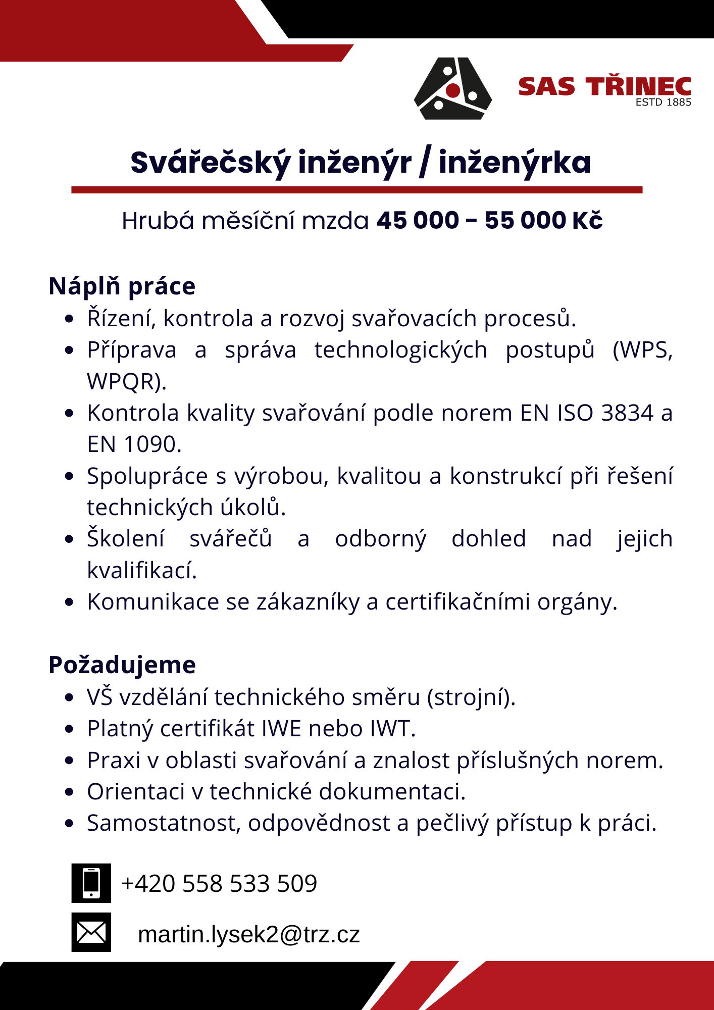 Volná pracovní místa Spolupráce se školami Benefity Strojírny a stavby Třinec, a.s. nabízí volná pracovní místa: